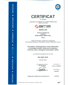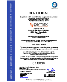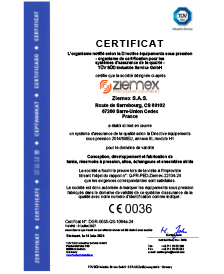 ZIEMEX est certifiée selon le Module D de la directive européenne 2014/68/UE (DESP) relative aux équipements sous pression. Cette certification atteste que nous appliquons un système d’assurance qualité spécifique à la fabrication de nos équipements, sous le contrôle d’un organisme notifié.