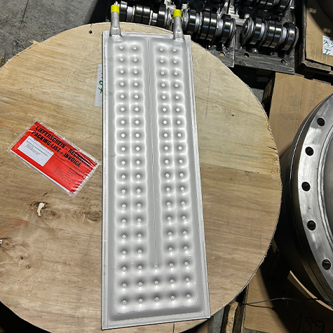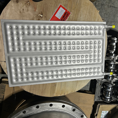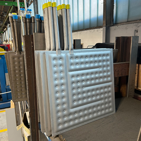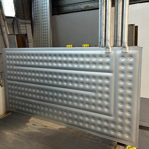 Les tôles utilisées ont une épaisseur de 1,5 mm et sont soudées entre elles grâce à des cordons circulaires réalisés par soudage laser. Après soudage, les plaques sont gonflées afin de déformer la tôle et créer ainsi des canaux permettant la circulation du fluide chaud ou froid utilité.